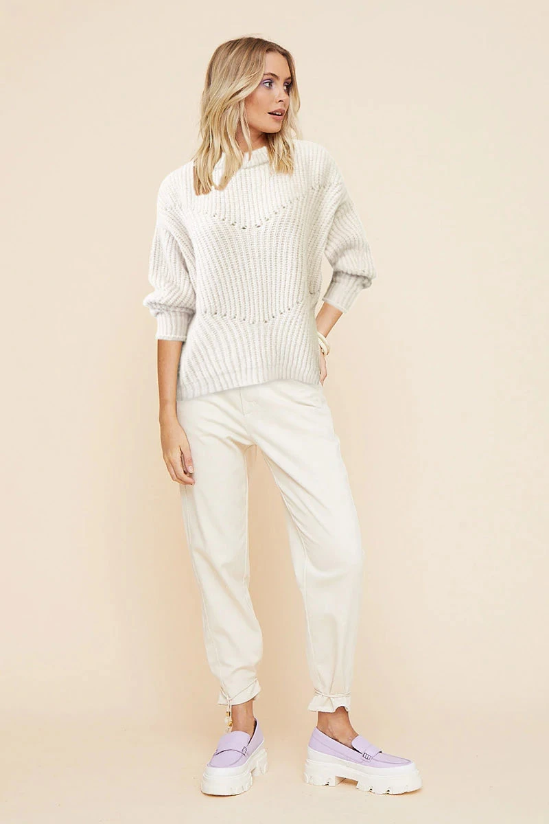 Our Fay Oversized Alpaca Knit Jumper in Ivory features a flattering cut high low hem and delicately cuffed sleeves. This style has been created with eye-catching knit patterns throughout. Pair back over a midi dress or with wide-leg trousers.