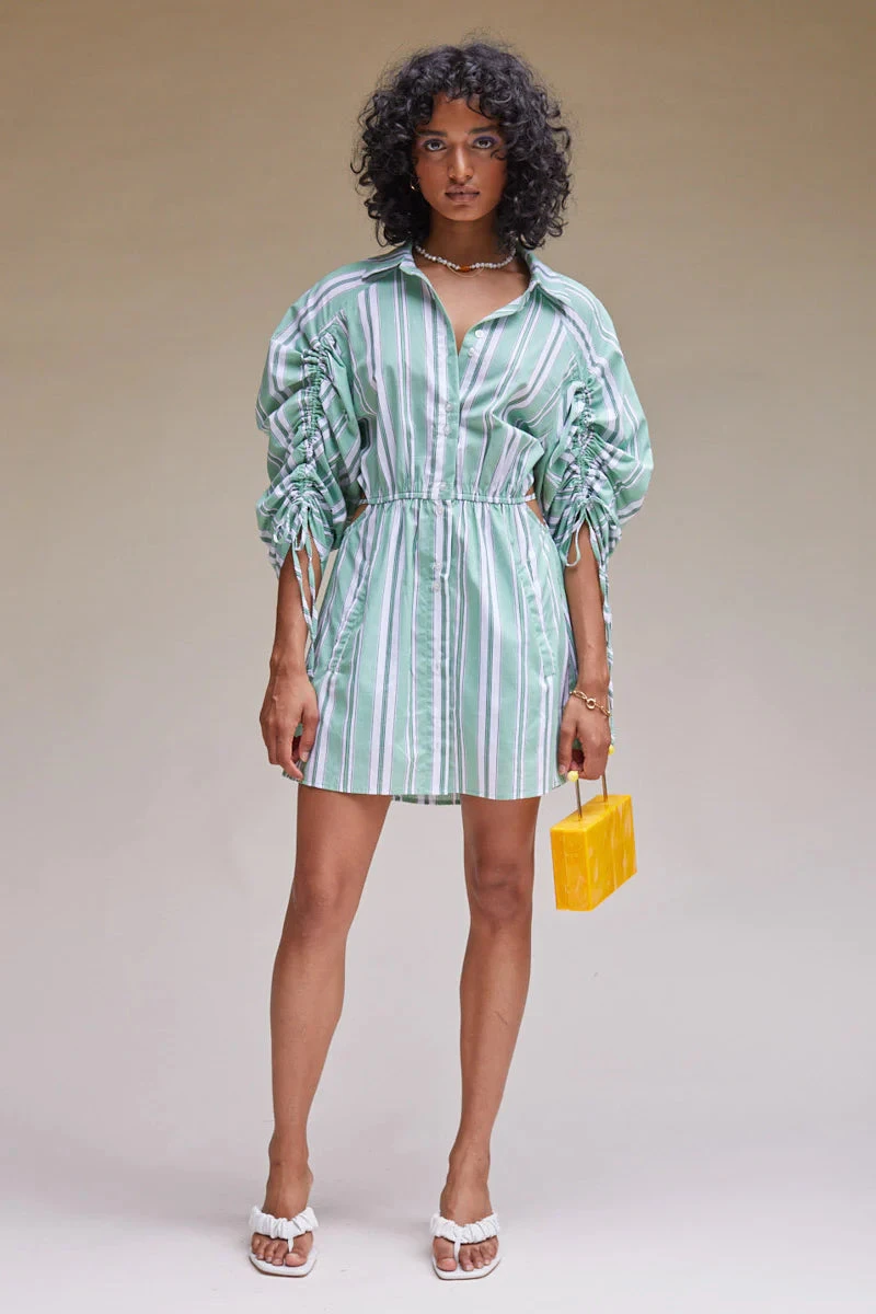 The Tali Gathered Sleeve Shirt Dress in Green Stripe is an evolution of the classic Shirt Dress. Featuring rouched detail sleeves, button-down front, and side cutouts; this dress is crafted in crisp cotton. Add sneakers or chunky sandal to complete the perfect daytime look.