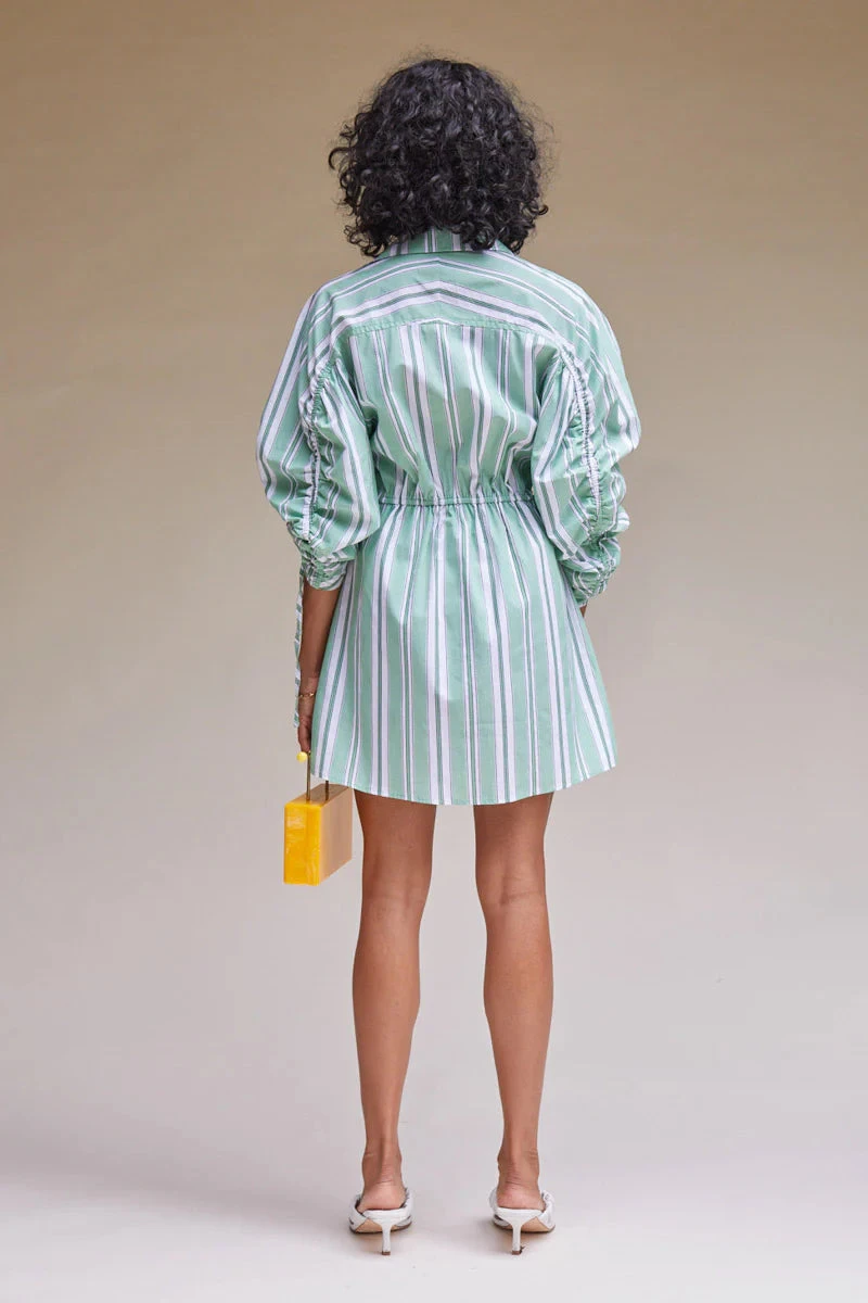 SUBOO – Tali Gathered Sleeve Shirt Dress (Green Stripe) FINAL SALE